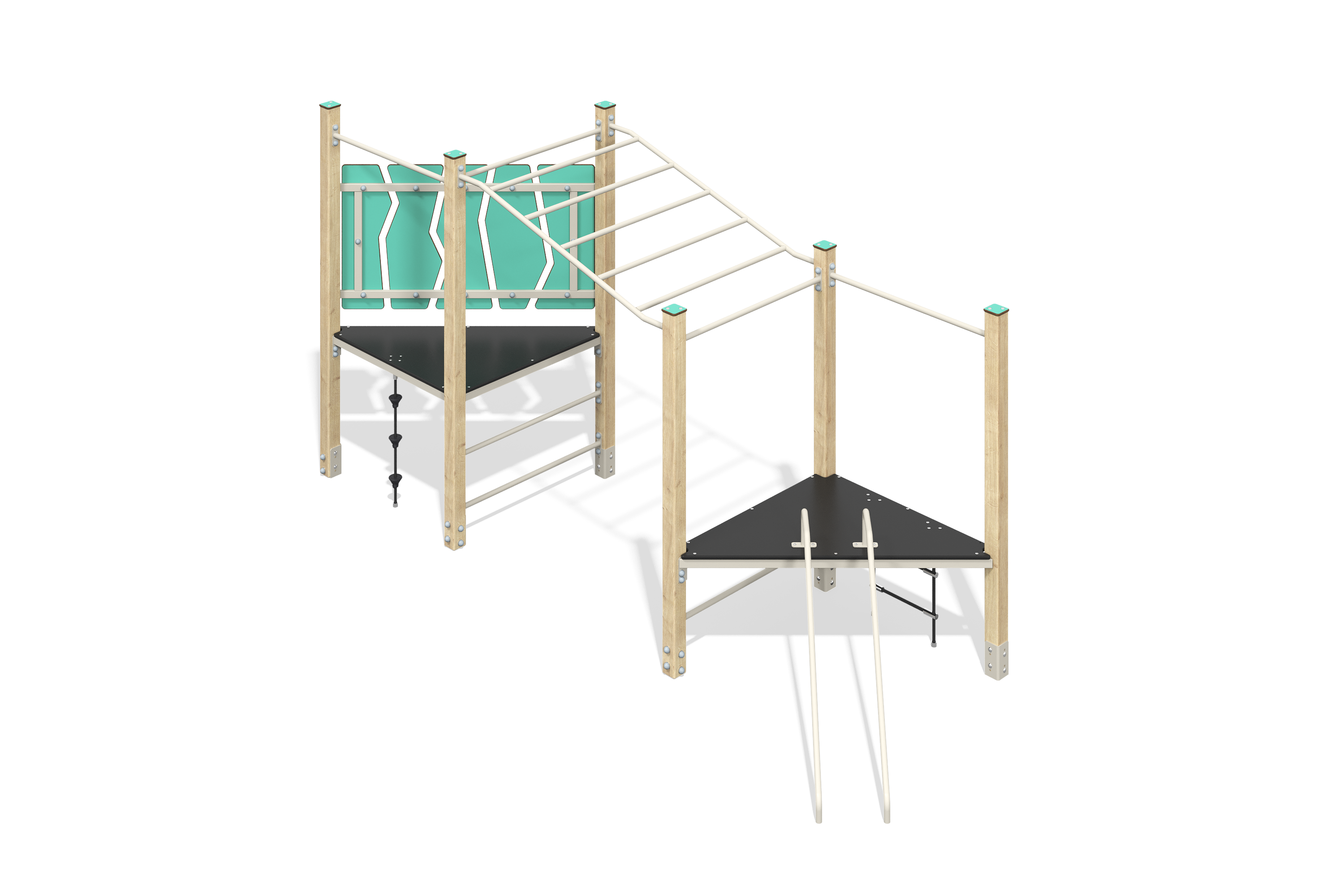 The ropeway offers children exciting play opportunities outdoors. It consists of two towers with a steel cable stretched between them, providing active play for children of different ages. The structure includes sturdy support posts and crossbars made of durable materials, ensuring reliability and longevity. The starting platform is conveniently located on the first tower, allowing children to easily begin their adventures. The ropeway promotes physical development, improves coordination, and helps overcome the fear of heights. The hanging seat and dampers ensure comfort and safety during use. This play installation will be an excellent addition to any playground, offering diverse opportunities for group play and active recreation.